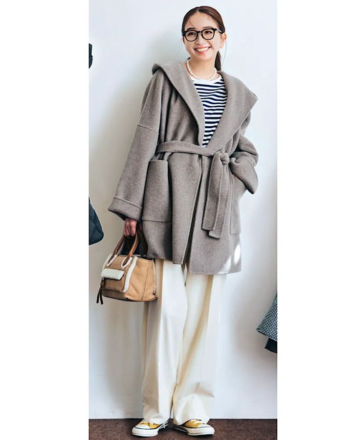 優しげなニュアンスカラーの中に、引き締め役のボーダーカットソーを投入してメリハリを意識。オーバーサイズのコートと、ワイドなシルエットのボトムスを合わせたルーズ感が今っぽさを加速させます。レディなムード漂う胸元のパールネックレスもポイント。