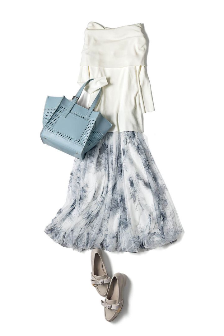 ラクチンなニット地のトップスに、花柄チュールスカートがドッキング。ふわりと広がるシルエットは、脚を崩してもバレないので実は座り仕事に最適! 異素材合わせのシャレ感も備わり、終業後はそのまま堂々とデートに向かえる華やかさです。キレイ色バッグとリボン付きローファーでも華感増を。