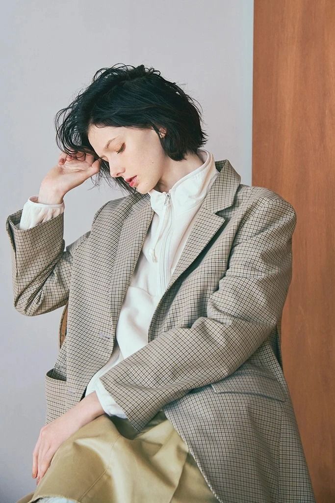 ニットのかわりにアクティブなフリースをとり入れた、大人に似合うプレイフル。実はスカートもひざ上のミニ丈だから、正統派なチェックジャケットもくだけた印象に。白とベージュでまとめたことで女性らしさはキープ。