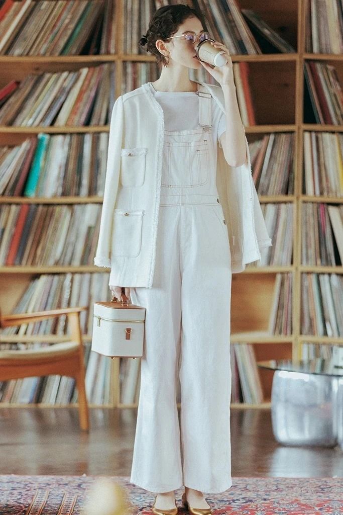 あどけなさが残るサロペットは、ルーズすぎない直線的なシルエットで大人に。ジャケットの中でも特に今盛り上がりを見せるクラシカルなツイード素材のジャケットを合わせて、日常になじむきちんと感のある仕上がりに。クリーンな白でまとめてツイードのほっこり感やサロペットの幼なさも回避。首つまり気味のインナーや散らしたゴールドで洗練さを高めて。