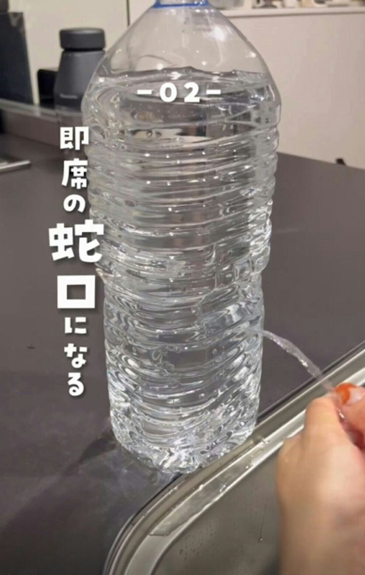 キャップを緩めると、穴から水が出て来ます。また、キャップを閉めると水が止まります。即席の蛇口の完成です。