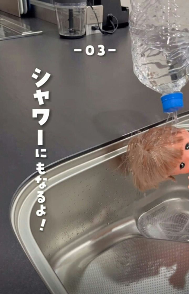 水を入れたペットボトルに、穴を開けたキャップをして傾けると、簡易シャワーの完成です。シャワーを使いたいときもペットボトルにおまかせ。お風呂に入れない状況のとき、子どもの頭や体をこのペットボトルの簡易シャワーを使って流すことができます。ぜひ覚えておきましょう。