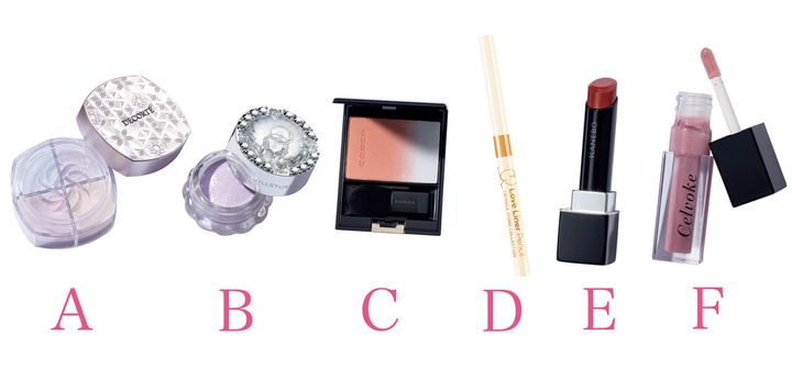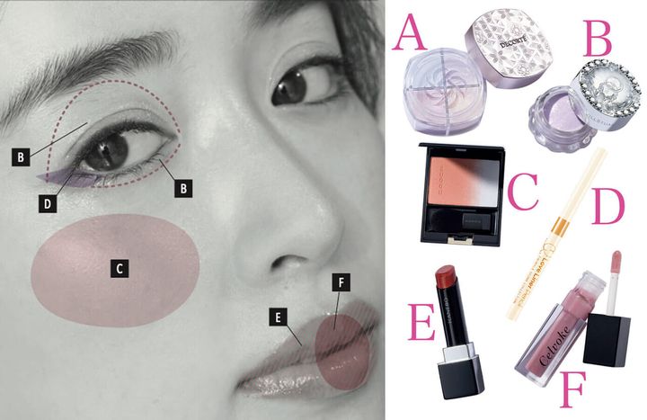顔全体とデコルテにもAのパウダーをのせ光のベールを仕込む。Bのジェルシャドウをアイホールには指で、下まぶたにはチップでのせる。Dのライナーで目尻側をはみ出すように大胆に跳ね上げる。Cのチークは血色感というよりはツヤを宿すイメージで、ふんわり丸くイン。 Eでリップラインを意識してオーバーめに塗り、唇の中央部分にFのグロスを追いのせ。色で厚みを、ツヤで立体感を演出。