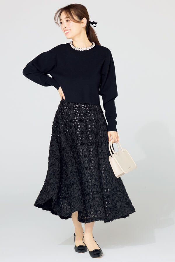 ニット¥17,600/ジャスグリッティー スカート¥23,100/アプワイザー・リッシェ イヤリング¥5,720/ピンク オウルビジュー(ロードス) リング[右中指]¥15,950、[左人さし指]¥11,000/ともにココシュニック オンキッチュ(ココシュニック) バッグ¥10,500/CHARLES & KEITH 靴¥18,150/ダイアナ(ダイアナ 銀座本店)