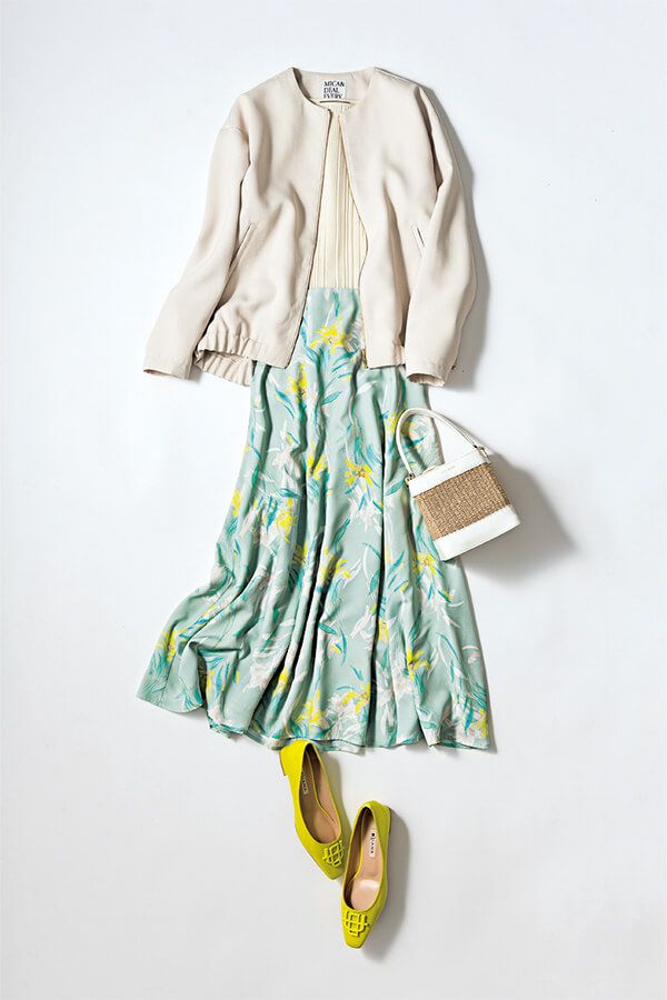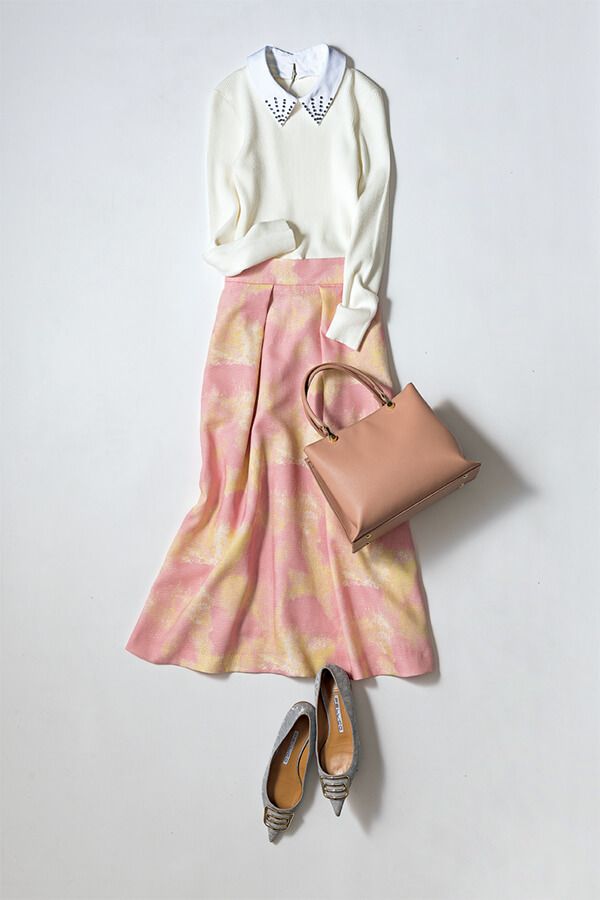 マイルドな印象の水彩柄は、デートでの彼ウケも上々♡ さりげないビジューがアクセントの白襟ニットとスクエアバッグで品格ある佇まいを意識すれば、全方位で好印象に。可愛さを守りすぎないのもレディに着こなす極意。