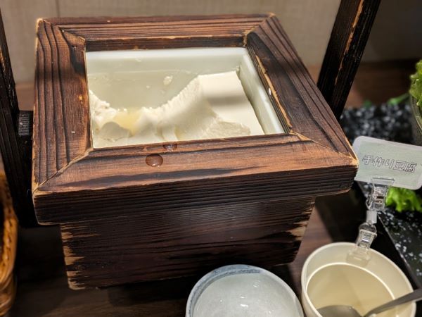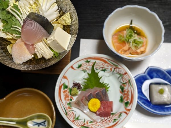 先付の蝦芋豆腐、お造りや寄せ鍋などが用意されているお座敷に通され、皆さんのテンションも上がります。優しいお出汁に浸った「蝦芋」はモッチモチ。新鮮で分厚いプリプリのお刺身や、さっぱりしたサーモンの酢の物、お野菜もたっぷりの鍋など、どれも美しく上品なお味です。