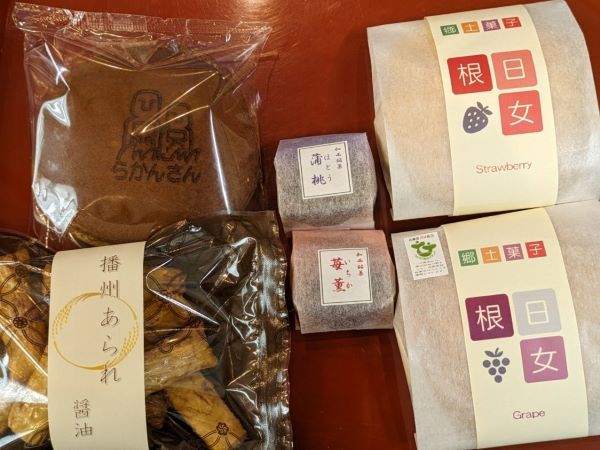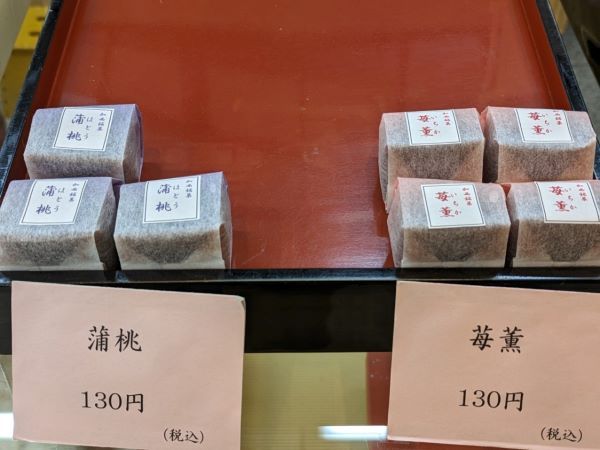 可愛らしい一口羊羹もありました。加西市で栽培が盛んな地域ブランド認証を受けたぶどう「加西ゴールデンベリーA 」を丸ごと1個入れたという「蒲桃」(ほとう)。苺の栽培も盛んで、「紅ほっぺ」を使用した「苺薫」(いちか)。