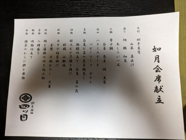 今回は如月懐石(6050円)をいただきました。(こちらの献立から蒸物を除いたもの) 1000円台から6000円台まで7種類ほどの御膳もありますし、会席料理は1000円単位でご予算に応じて用意できます(要予約)ので、詳しくはお問い合わせください。