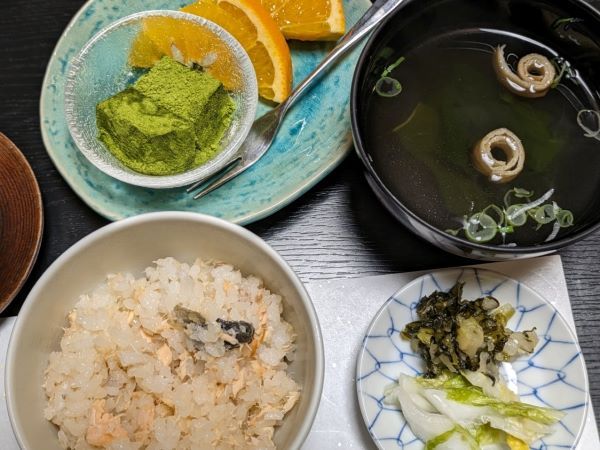 炊き込みご飯や、たっぷりのお抹茶にまとわれた、すくうのがやっとなくらい柔らかいわらび餅まで、全ておいしくいただきました。