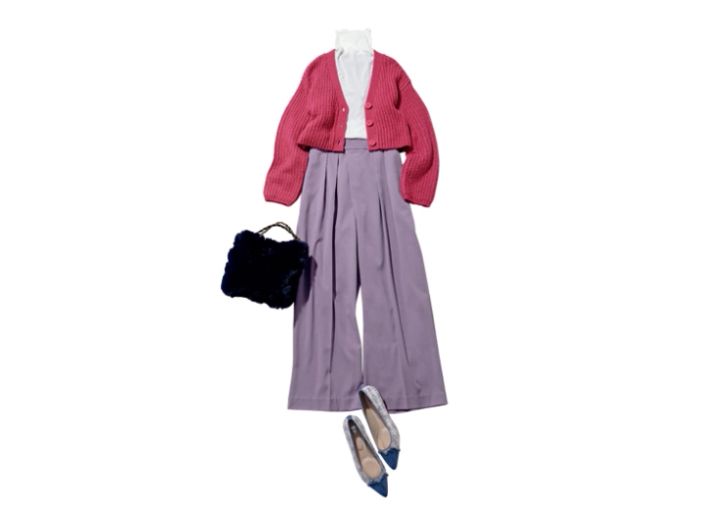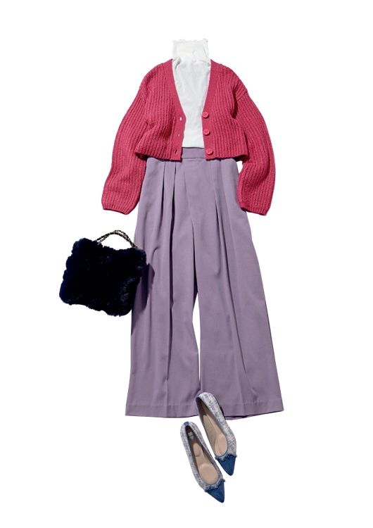 シアーカットソー¥1,590/神戸レタス、カラーワイドパンツ¥10,900/イェッカ ヴェッカ 吉祥寺、カーディガン¥12,650/JILL by JILLSTUART、エコファーバッグ¥13,750、ツイードパンプス¥15,950/ともにダイアナ(ダイアナ 銀座本店)