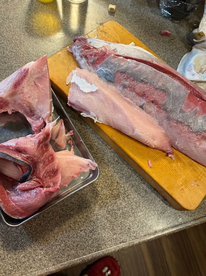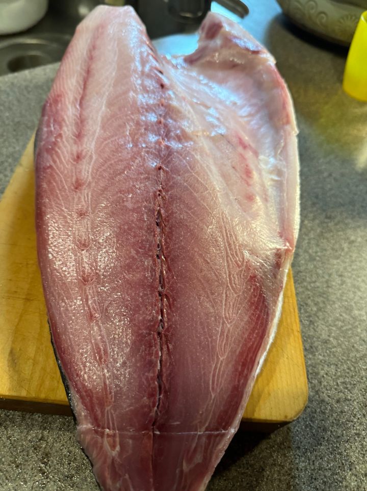 さばくっていっても、カマ(あご)の部分を切り落として、中骨の部分を切り分けて腹と背に分けて皮を剥くだけです。皮を剥く時に若干の失敗はありましたが、まぁそこは愛嬌ってことで。