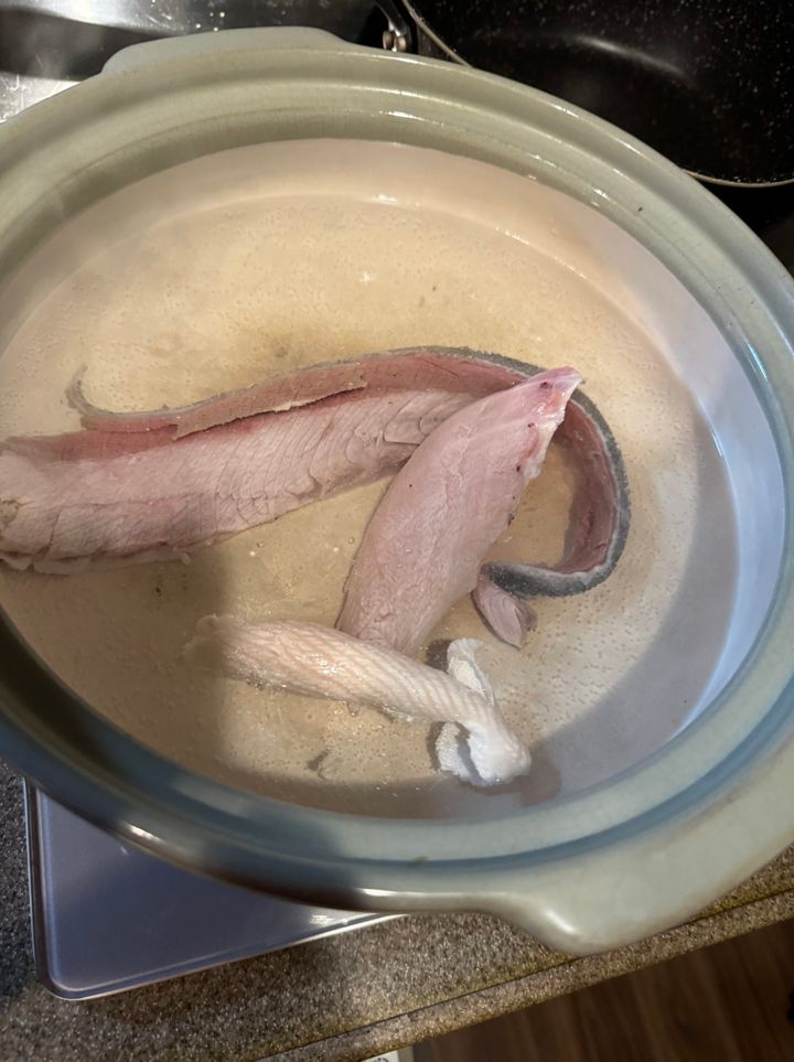 さっそく準備したいと思います。アラというか骨の多いところを出汁にして…