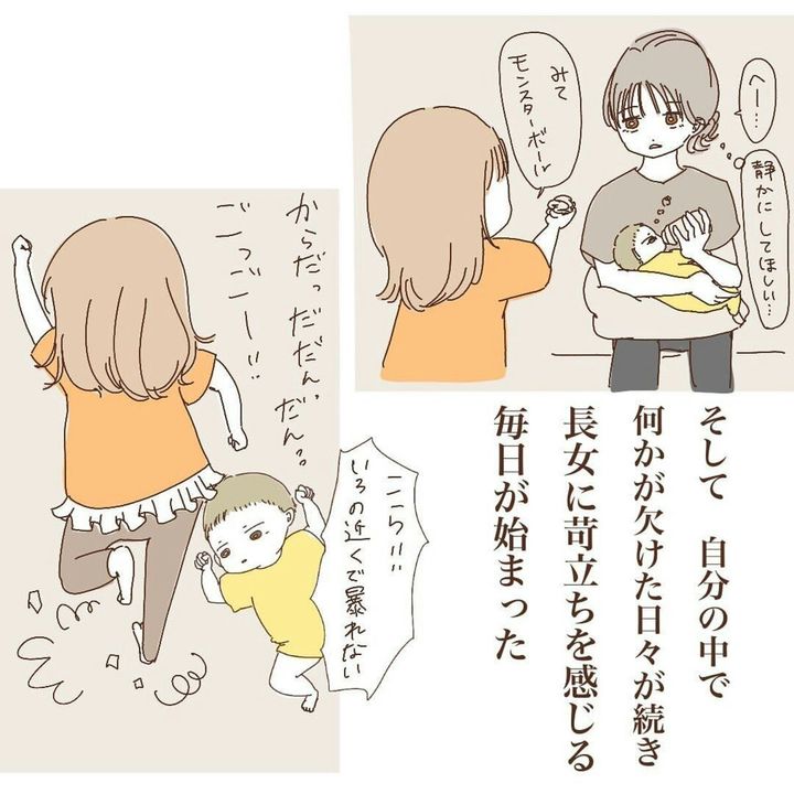 このお話の主人公であるまぎ.さんは2人目を出産しました。2人目の出産前に「下の子を産むと『上の子かわいくない症候群』というものになる人もいる」という情報を目にしましたが、当時は自分とはかけ離れた話だと思っていました。しかし2人目を出産してみると、上の子にイライラするシーンが増え、上の子に対し「かわいい」という気持ちを持てないことも。それから「こんな母親は最悪」という罪悪感や、「昔のように心の底からかわいいと思いたいのに」という葛藤が生まれ、まぎ.さん自身が追い込まれてしまいます。