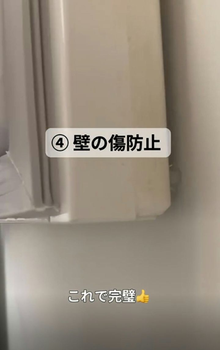 クッションゴムを1つ用意し、冷蔵庫の扉と壁が接する部分の壁側に貼り付けます。