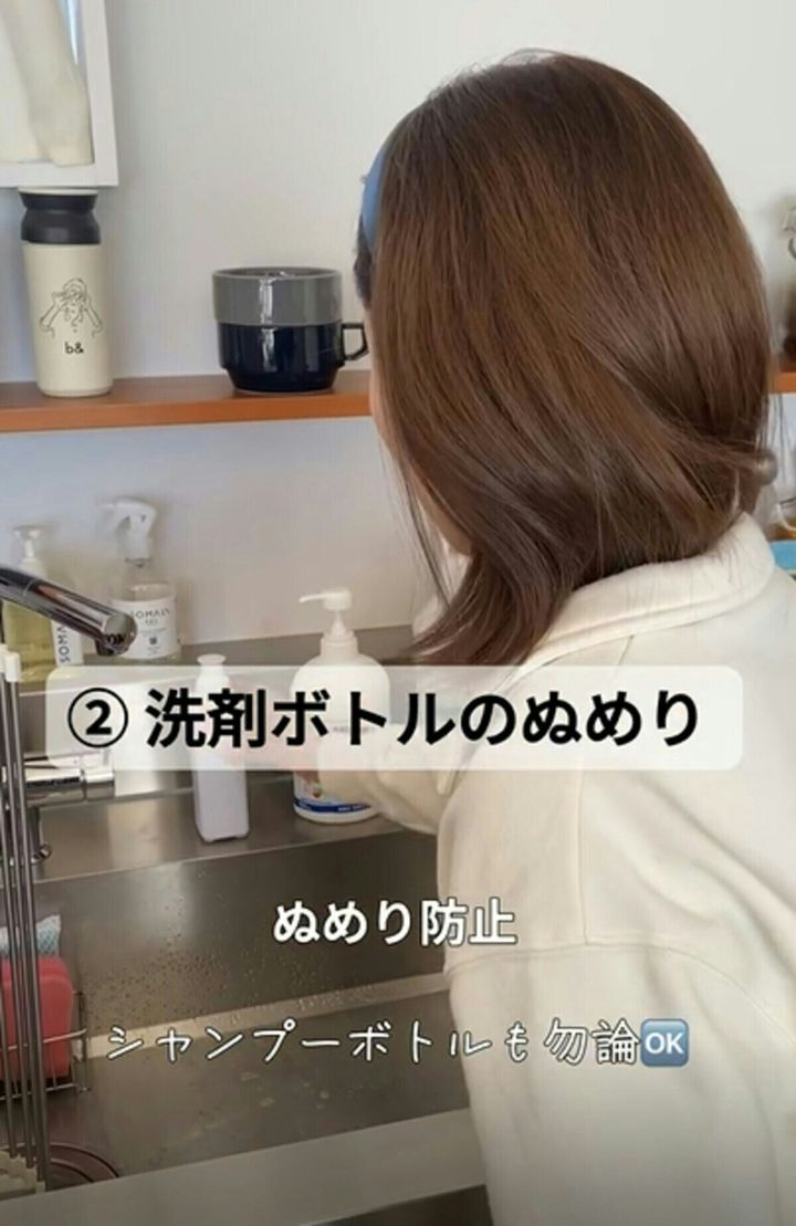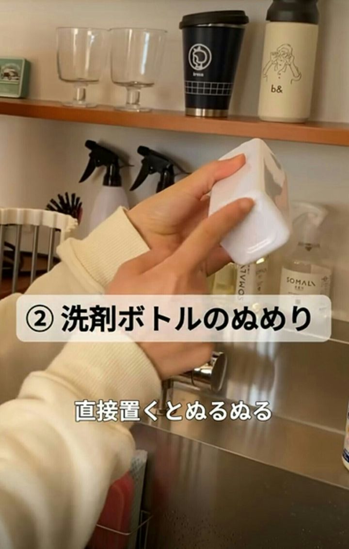 食器洗い洗剤のボトルをシンクに直で置いていると、気が付けばぬめりが発生してしまっていることも。