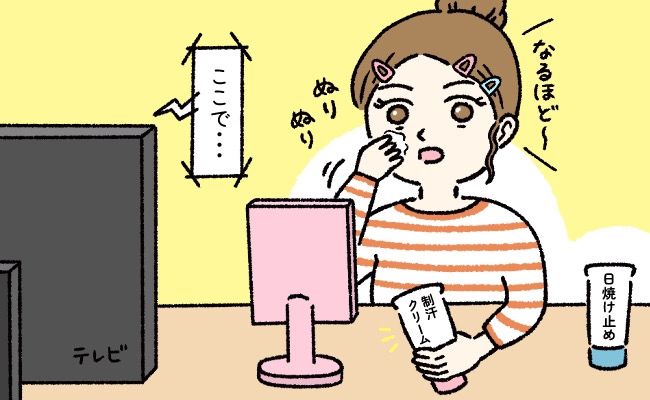 テレビをぼーっと見ながらまずはベースメイクを始めた私。途中で「なんか変だな?」と思って手元を確認すると、顔に日焼け止めを塗っていたつもりが、脇に塗るクリームを間違えて塗っていました。
