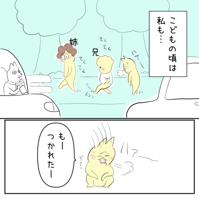 姉と兄と歩いていたとき、疲れてしまい道に座り込む私。