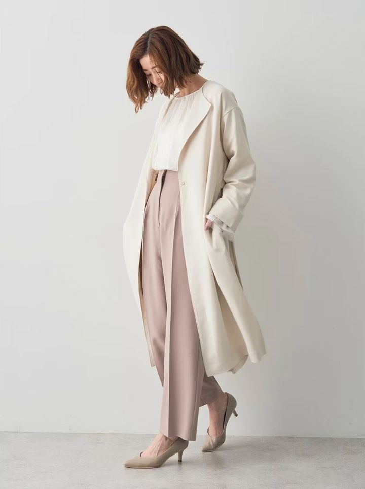 重たくなりがちなロングコートでも、アイボリーなら軽やかに着こなせます。