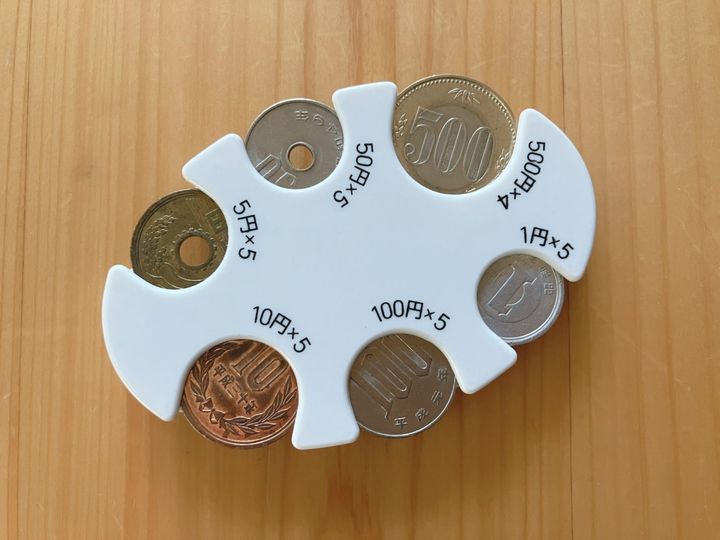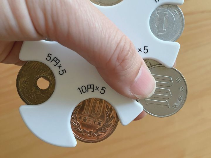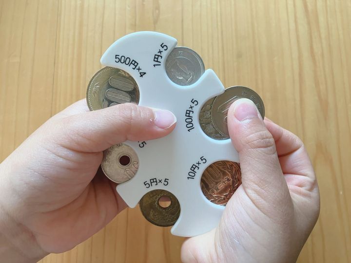 子どもだと両手を使って扱う感じ。5歳の次男も上手に扱えていました。1枚ずつスライドして取り出すので、財布の小銭入れから探すよりも時短になりそう!硬貨ごとに分かれているから一目でわかりやすいですよね。