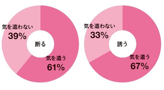 誘うにせよ断るにせよ、気を遣うという人が多数派に。誘う立場の場合は、「公私混同したくないかもしれないから」「無理やり来てほしくない」など相手への配慮が影響している人もいれば、「家族構成や住んでいる場所、金銭的なことなどを考慮して設定するのが大変」など気苦労が増えることが嫌という声も目立つ。また、「断られたら気まずい」と、今後の人間関係への影響を気にする人も。