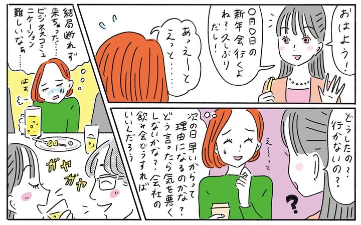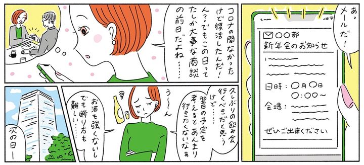 「大人数で集まる宴会は嫌だけど、少人数でコミュニケーションがとれる飲み会には行きたいという声が多い印象です。気持ちを聞いてほしいという部下や、部下の情報を得たり、自分を知ってもらいたいと思う上司は少なくないです。行きたくない時は、『今回は参加できません』と断り、理由を言う必要はありません。詮索はハラスメントになります。避けられない会の場合は、遅刻や途中抜けもOK。行くことに意義があるので、『厳しいのですが少しだけ顔を出します』と切り抜けましょう。今は、それを咎める人のほうが、白い目で見られる時代です」