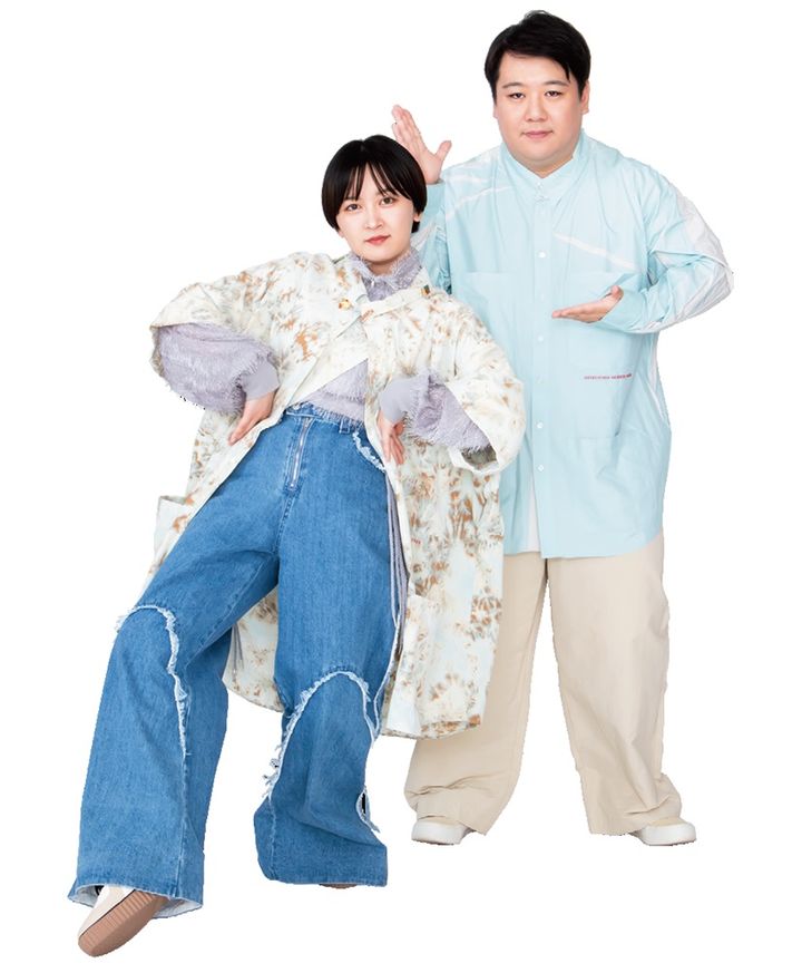 サーヤさん・シャツ¥40,700(ボディソング info@bodysongbodysongbodysong.com) 中に着たトップス¥11,000 パンツ¥11,000(共にセイト/アンティローザ TEL:03・6431・9431) シューズはスタイリスト私物 ニシダさん・シャツ¥42,900(ボディソング) パンツ¥6,930(ドープス/アンティローザ) シューズはスタイリスト私物
