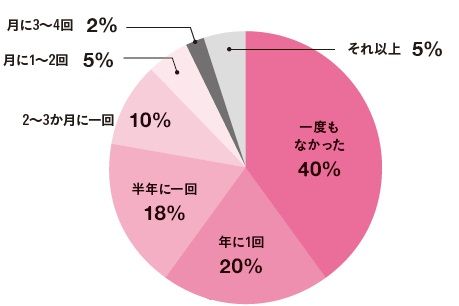 一度もなかった…40%、年に1回…20%、半年に一回…18%、2~3か月に一回…10%、月に1~2回…5%、月に3~4回…2%、それ以上…5%