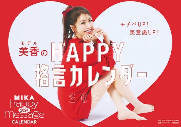 「andGIRL」で特集するたびに大反響を呼び続けている美香ちゃんの〝美〟格言たち。生き方がガールな美香ちゃんは、永遠に私たちのお手本。そんないつだって進化が止まらない美香ちゃんのモットーを今回カレンダーに詰め込みました。会社のデスクに飾るもよし、ドレッサーの前でもよし!きっとこのカレンダーが、あなたの毎日のHAPYYを後押ししてくれるはず。もう二度とないかも!?永久保存版の付録、ぜひチェックしてみてくださいね♡