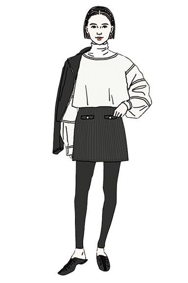 「似た風合いどうしのスタイリングが多かった冬から一転、春はチュールなどシアーな生地に重たい素材を合わせたMIX感を楽しみたい。まだ肌寒い今なら、白タートルにレイヤードし、あえてトーンを合わせるのがかわいい」(塚田さん)