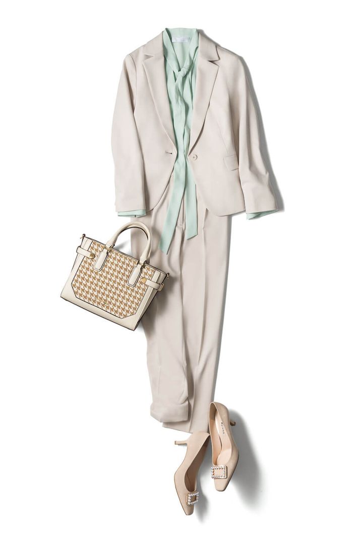 淡い色みのジャケットに映えるのが、甘さ漂うパステルカラー。ミントグリーンならさわやかさも備わり、クライアントからの好感度もお墨付き!