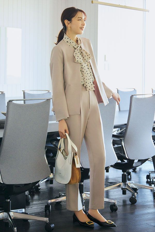 ジャケット¥8,789、パンツ¥5,929/ともにVIS ブラウス¥18,700/ストラ ピアス¥2,400/ヘンカ(ロードス) バッグ¥72,600/ジャンニ キアリーニ(ジャンニ キアリーニ 銀座店) パンプス¥38,500/ファビオ ルスコーニ ペル ワシントン(銀座ワシントン銀座本店)