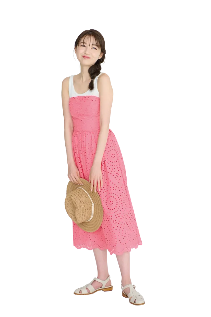 ピンクワンピース 7,999円/H&M 白タンクトップ 4,400円/Ungrid 帽子 4,490円/Gap サンダル 19,800円/ダイアナ(ダイアナ 銀座本店)