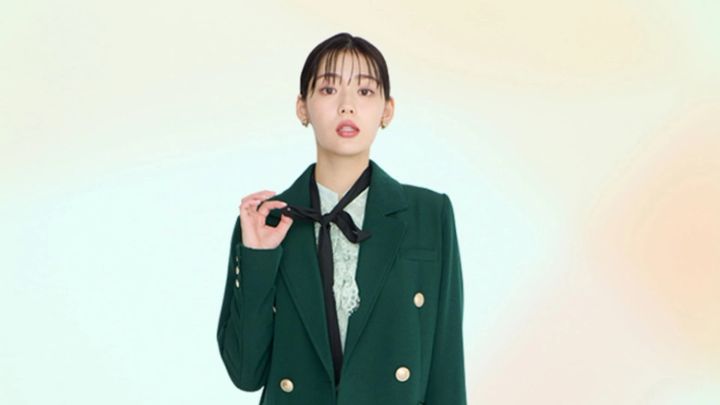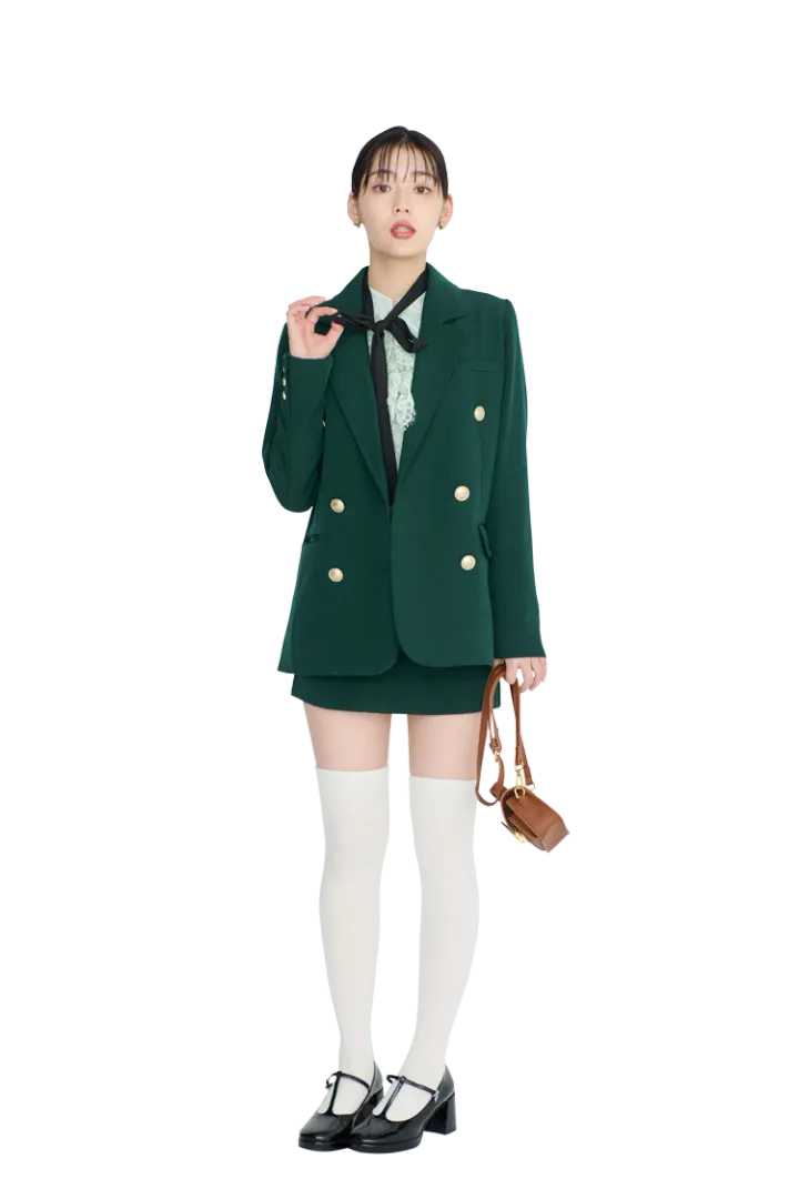 グリーンジャケット 16,500円、ミニスカート 9,900円/ともにDarich(YSM) ボウタイブラウス 14,960円/LILY BROWN イヤリング 9,870円/アビステ バッグ 参考商品/ACYM ニーハイソックス 1,540円/靴下屋(Tabio) パンプス 10,500円/チャールズ&キース(チャールズ&キース ジャパン)
