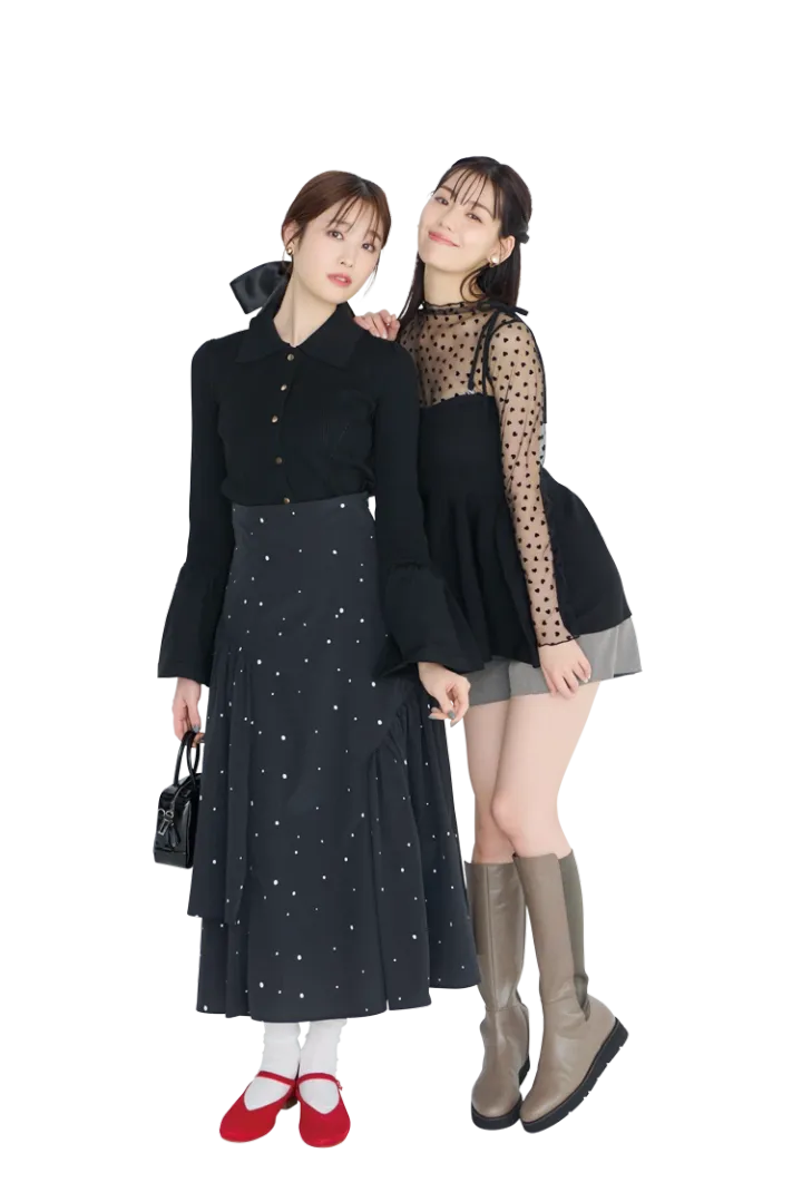 [左のコーデ]黒ニット 9,680円/COCO DEAL(ココ ディール) 黒ドットフレアースカート 14,300円/MERCURYDUO ルミネエスト新宿店 イヤリング 6,300円/アビステ バッグ 18,700円/ADD CULUMN(ROSE BUD ルミネエスト新宿店) バレエシューズ 17,050円/moumoune ソックス、リボン/ス [右のコーデ]黒ぺプラムビスチエ(カーディガンとセット) 20,900円/ME COUTURE(DEICY ルミネ新宿店) 黒ハートチュールトップス 5,400円/Treat Ürself グレーショートパンツ 7,700円/RESEXXY イヤリング 7,560円/アビステ ブーツ 29,150円/ダイアナ(ダイアナ 銀座本店)