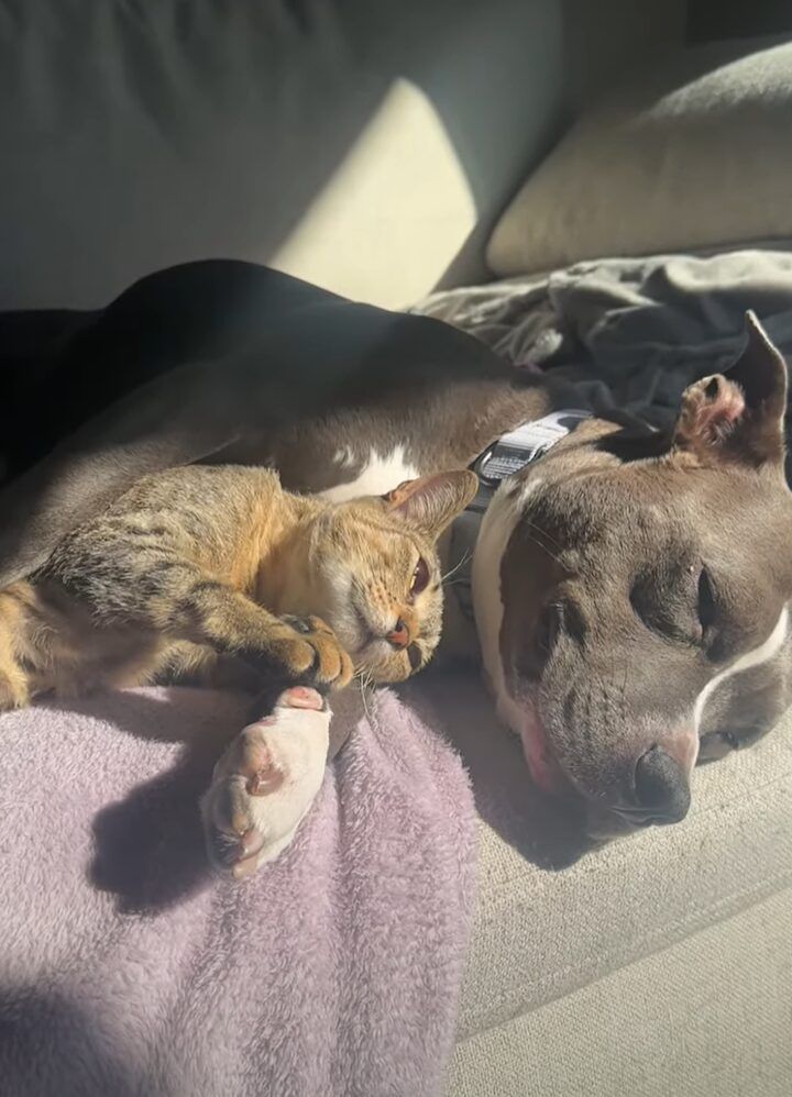 3. 一緒にぬくぬくひなたぼっこをするピットブルと猫。ピットブルに腕枕やだっこしてもらう猫の姿にほっこり【アメリカ・動画】