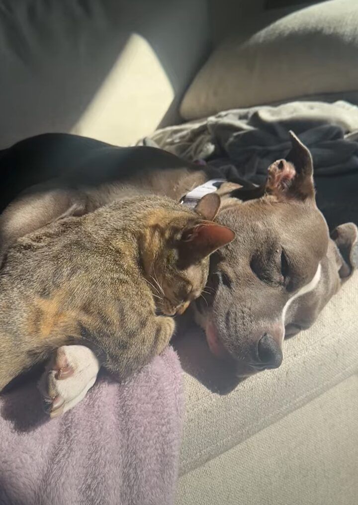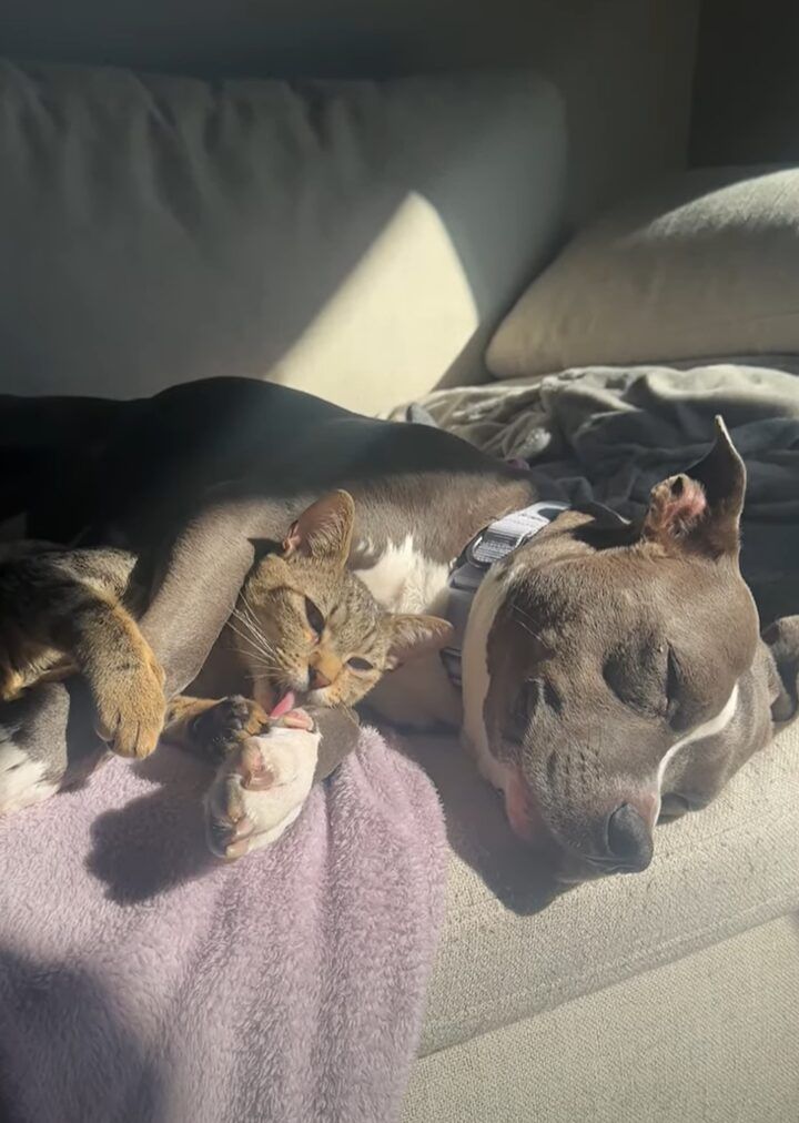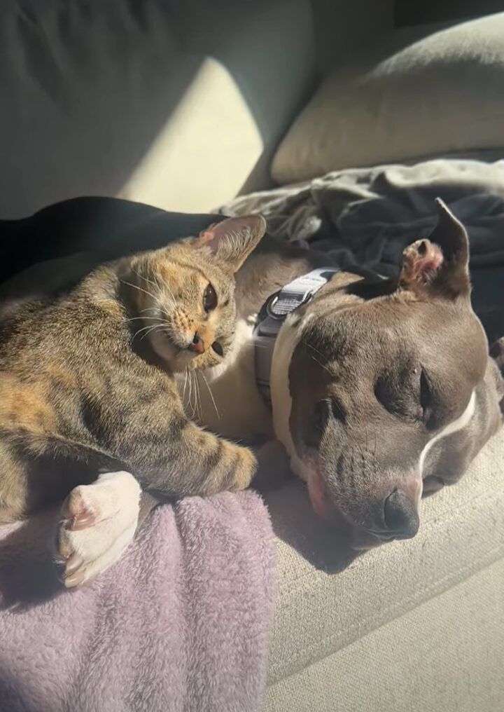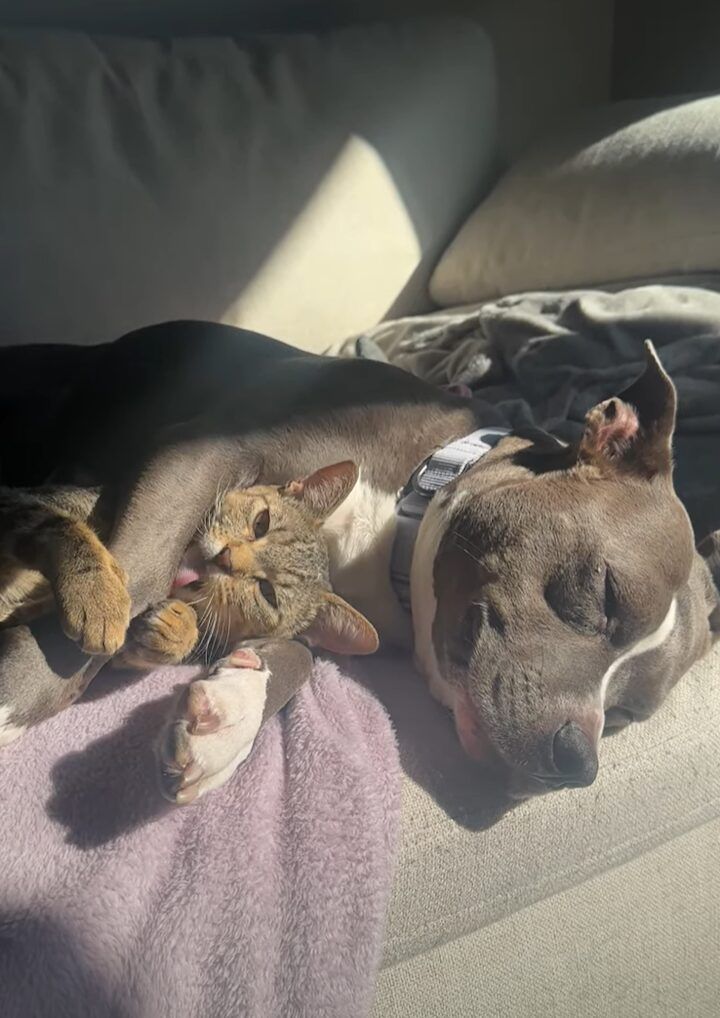 温かい日差しの中、ソファで身を寄せ合っているのは、ピットブルの『ベラ』と猫の『ルル』。 ルルは、大きなベラに腕枕をしてもらっています。