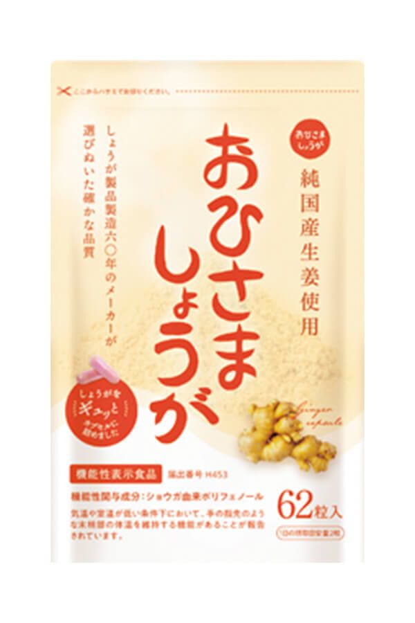 生姜由来ポリフェノールを手軽にとれるカプセルタイプ。手の指先の冷え性対策や代謝アップにも効果的。「体が芯から温まる生姜の温活サプリ。飲みやすいカプセル型で無理なく続いています。味噌汁に入れても美味♡」