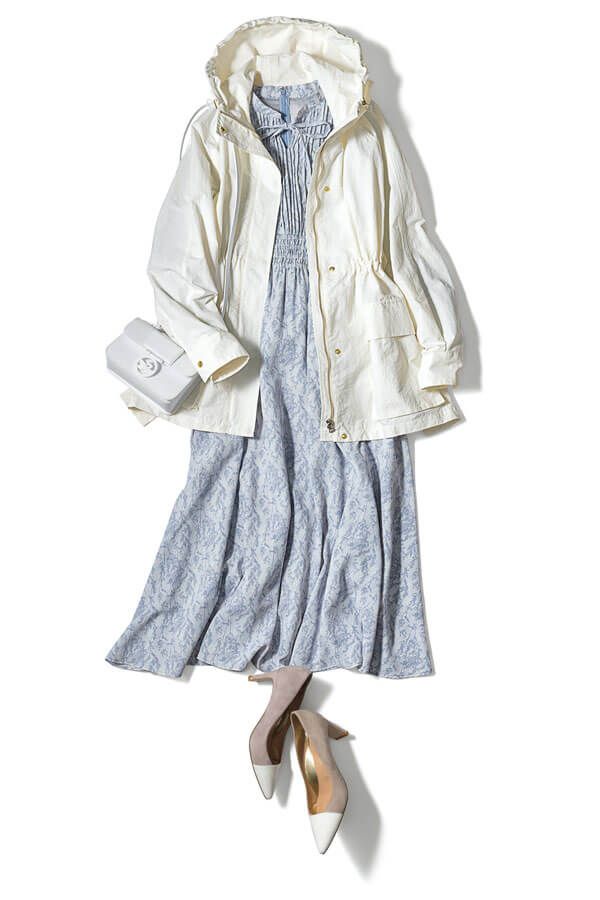 白のアウターが透明感たっぷりなブルーワンピを引き立てるMIXコーデ。クリーンな白なら、カジュアルな印象を払拭してくれます♪
