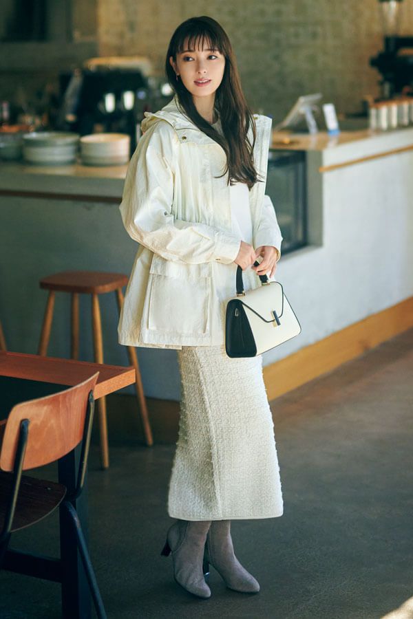 マウンテンパーカ¥37,400/アルページュ ストーリー ニット¥35,200/グレースクラス(グレースコンチネンタル 代官山本店) スカート¥39,600/ダイアグラム(Diagram 表参道ヒルズ店) バッグ¥588,500/ヴァレクストラ(ヴァレクストラ・ジャパン) ショートブーツ¥37,400/銀座かねまつ(銀座かねまつ6丁目本店) イヤリング¥14,300/アンテプリマ(アンテプリマ 新宿髙島屋店)