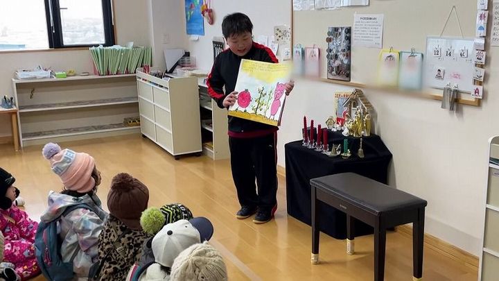 先生たちと一緒に、教室で手作りした絵本を、市内の幼稚園児に読んであげることにしたのです。