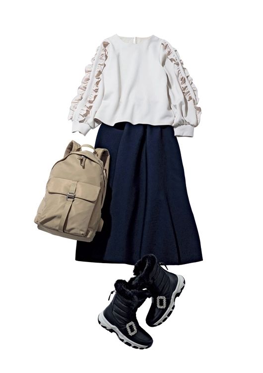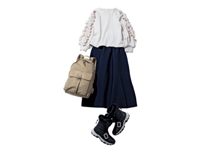 ニットセットアップ スカート¥11,000/PLST、フリル付きプルオーバー¥4,950/オペーク ドット クリップ、スノーブーツ¥19,800/プラス ダイアナ(ダイアナ 原宿店)、リュックサック¥6,590/ZARA(ザラ)