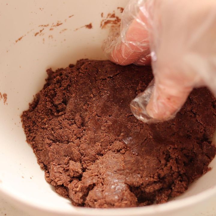 2. 製菓用米粉、ココアパウダー、ジンジャーパウダーを加えてゴムベラで混ぜて生地をまとめる。