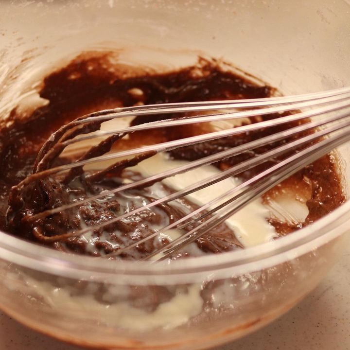 2. 1のボウルに砂糖を加えて混ぜ、さらに卵を1つずつ割り入れその都度よく混ぜる。製菓用米粉、ココアパウダーも加えて混ぜ合わせる。