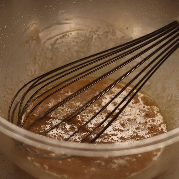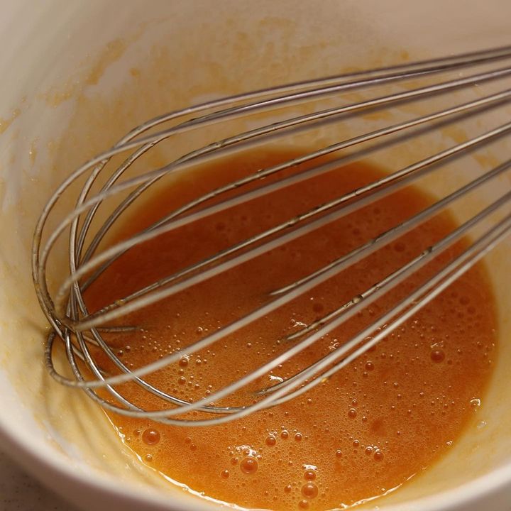 1. 卵を割りほぐし、メープルシロップ、植物油、砂糖を加えて泡立て器で混ぜ合わせる。