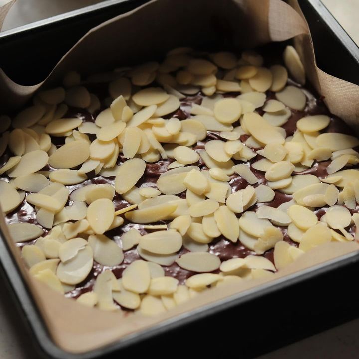 3. 型に生地を流し入れ、アーモンドスライスをトッピングして、170℃のオーブンで25分ほど焼く。焼き上がったら粗熱をとる。