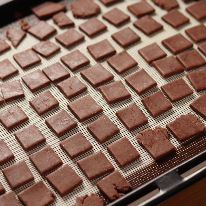 4. オーブンシートを敷いた天板に並べ、160℃のオーブンで27〜28分ほど焼く。焼き上がったら、天板の上で冷ます。