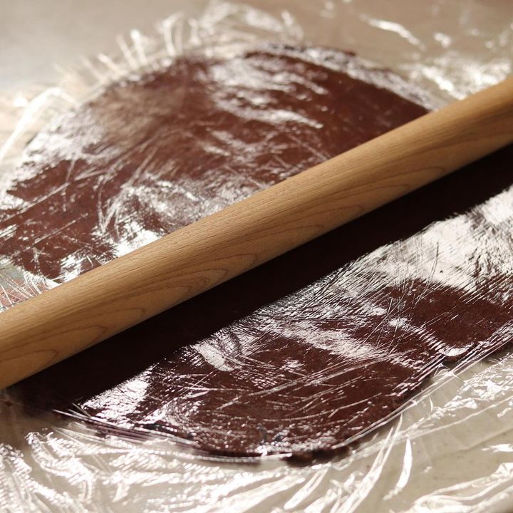 3. 生地を2枚のラップで挟み、麺棒で薄く伸ばし、お好みの大きさに包丁で切り分ける。