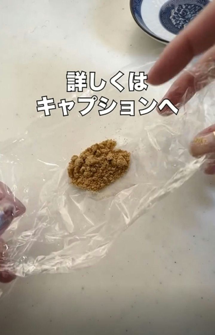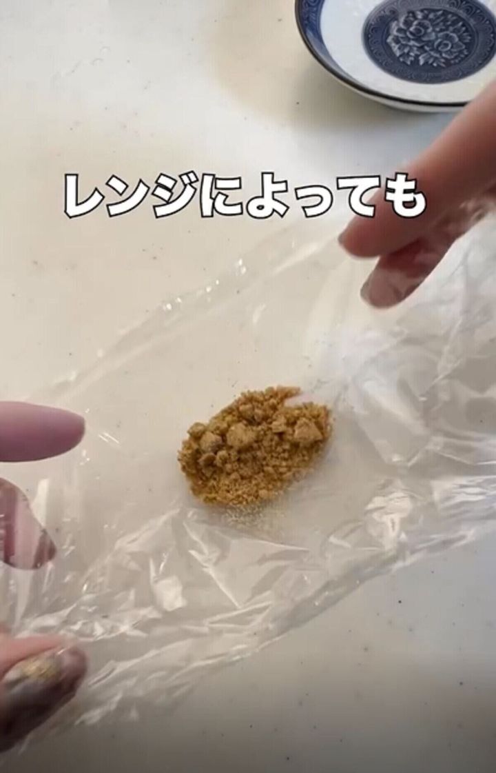 加熱後、ラップに包んだコンソメを取り出して、ラップから出さずにそのままの状態でラップの上から指を使ってコンソメをつぶしていきます。