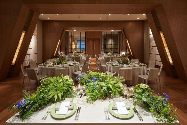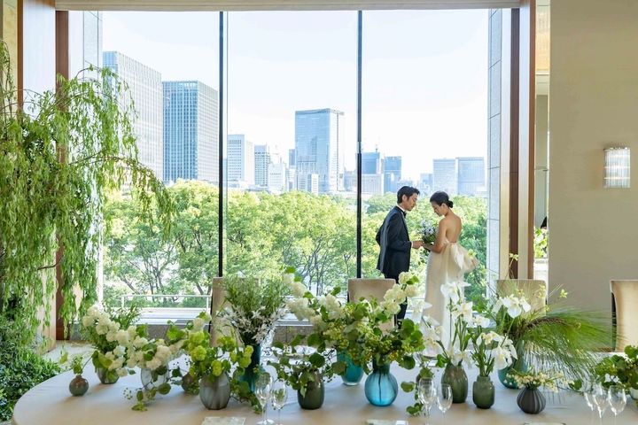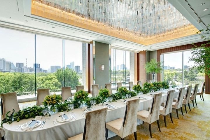 「パレスホテル東京」の邸宅風バンケットの中でもおすすめなのが「桔梗」。二面のピクチャーウインドウからは自然光がたっぷりと入り、皇居外苑の緑が見渡せます。インテリアも洗練されており、モダンなシャンデリアがラグジュアリーな雰囲気を演出。