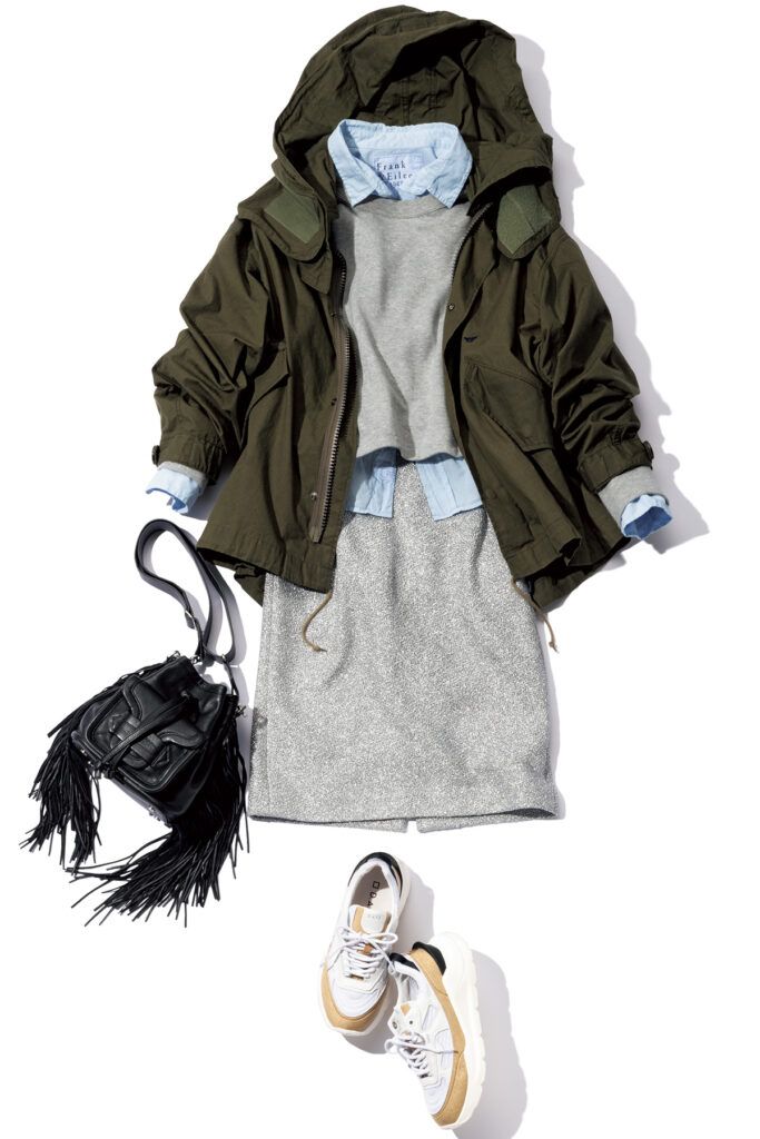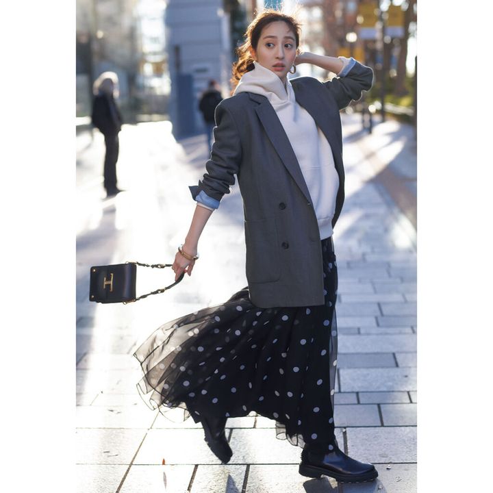 〝カッコいいスポーティ〟が約束された上半身で受け止めるのは、シアーな素材のふんわりスカート。重ねるのはアイテムだけでなくテイストも。カジュアル、ハンサム、フェミニン…一言では言い表せない奥深さが、この春の狙いです。フーディ¥42,900(ユニオンランチ/サザビーリーグ)ジャケット¥80,300(ebure/ebure GINZA SIX店)スカート¥37,400(プルミエ アロンディ スモン/プルミエ アロンディ スモン NEWoMan新宿)バッグ¥289,300ブーツ¥113,300(ともにトッズ/トッズ・ジャパン)ピアス¥13,200バングル¥28,600(ともにワンエーアールバイウノアエレ/ウノアエレ ジャパン)